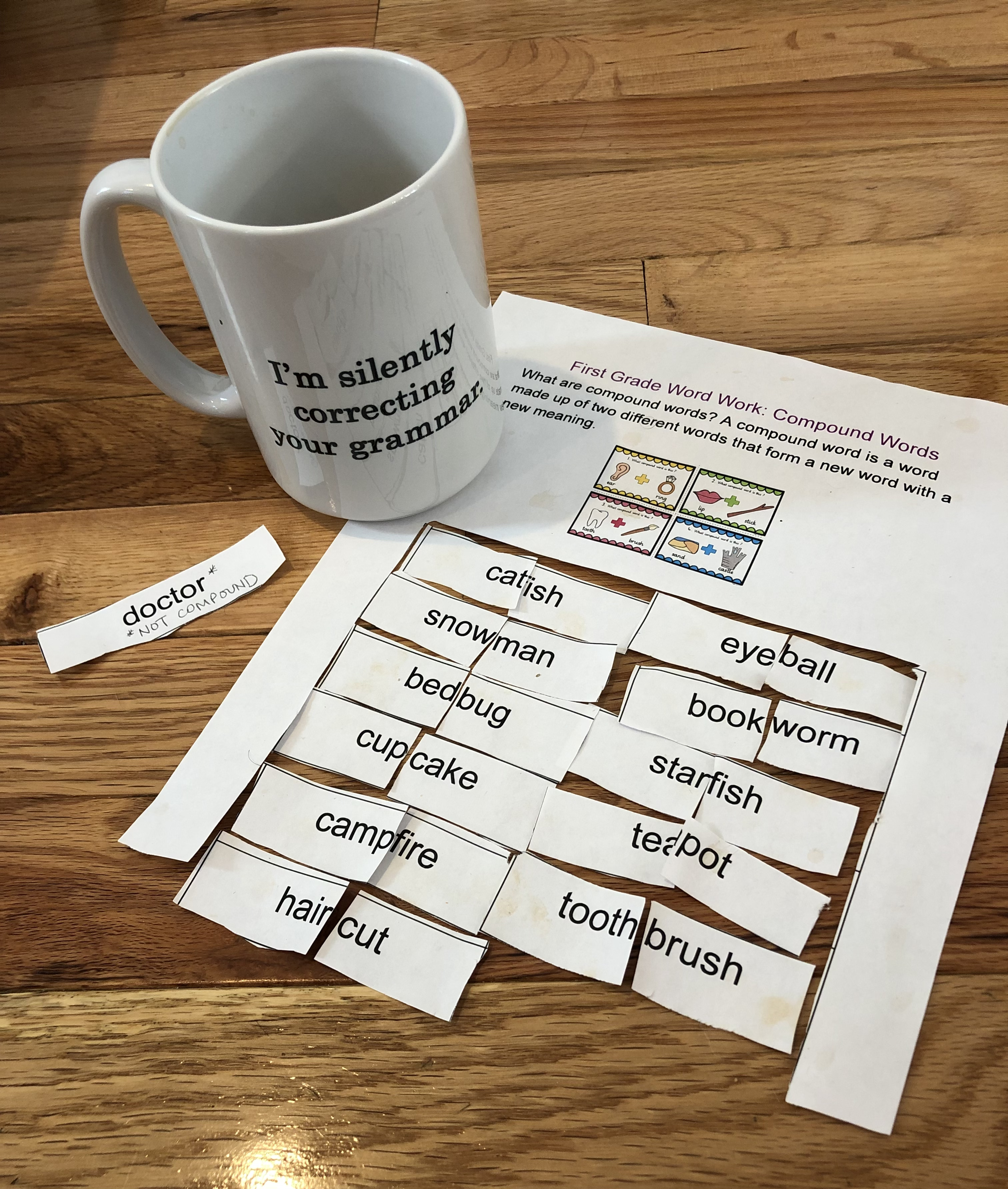 Our school held a “remote learning day” last month, which is basically defined as “one Infernal ring away from fresh hell”. The two older kids managed it on their own for the most part, thank goodness, but the six-year-old first grader needed one-on-one attention for the entire seven-hour process. At one point we were on the living room floor detaching and reattaching compound words he’d cut out of a worksheet, and I’d just explained that although the word “doctor” was on the list, it wasn’t actually a compound word. He said, “But ‘dock’ and ‘tore’ are both words!” After some more discussion and explanation about how “doctor” must have been included by mistake, we decided to set that word aside and focus on the others. After the reassembling process (which took extra time because he identified “teacup” as a mashup of the original words “teapot” and “cupcake”, as well as “hairbrush” as a fusion of parts of “haircut” and “toothbrush”, but using those new words would have left us with “toothcut” and “potcake”), he was supposed to take a photo and post it to the school-moderated app aptly named “Seesaw”. I was drinking coffee at the time, naturally, and out of pure coincidence, my mug du jour boasted a snarky language-snob slogan. I didn’t make this connection until my pupil showed me the picture he’d taken on his iPad as proof of assignment completion, an image in which both of my knees and my cup of caffeine were featured, but after seeing my mug juxtaposed with his homework, I couldn’t miss this photo-op setup: