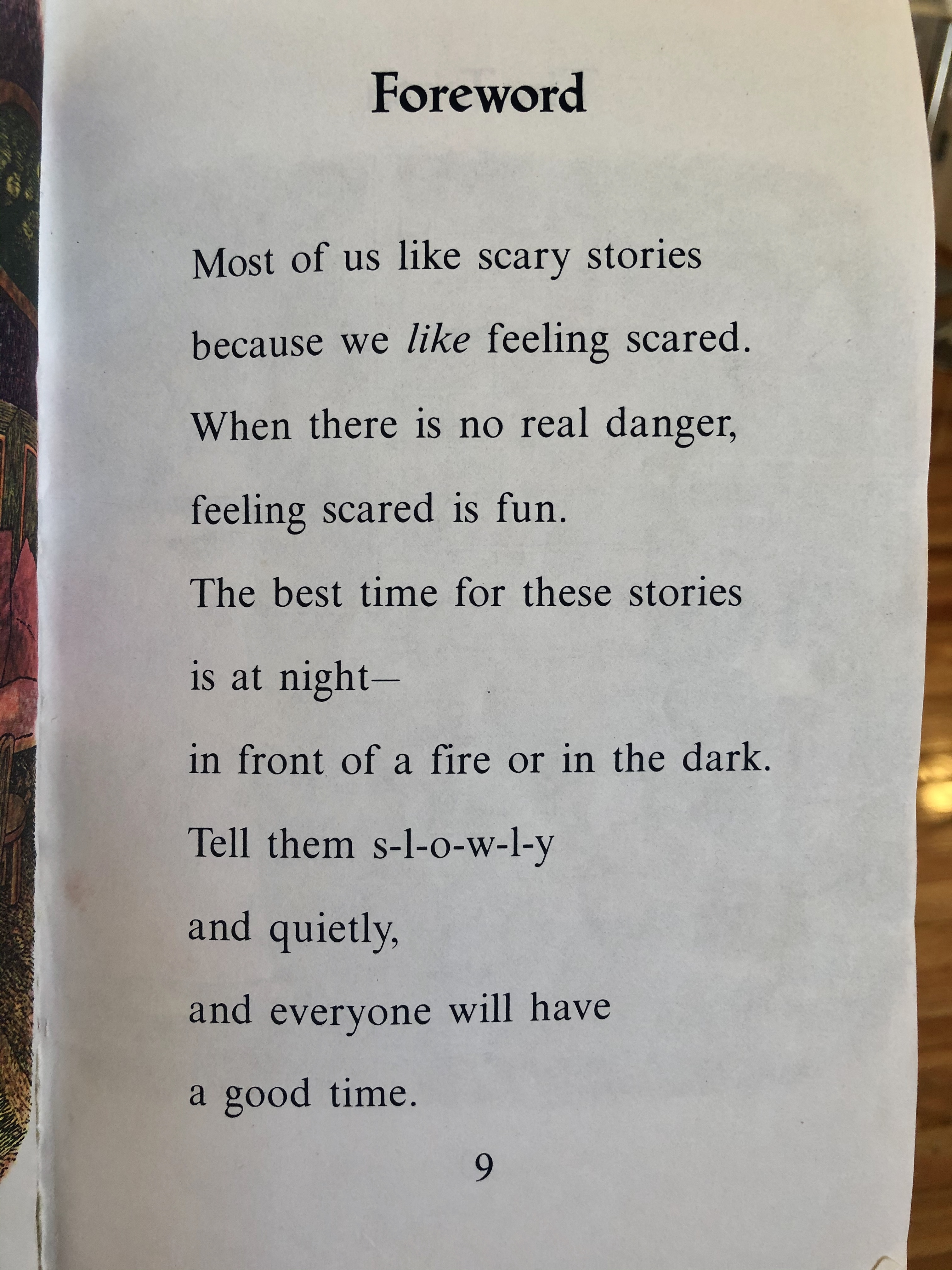 As a child, I remember reading that story and being completely petrified (there’s actually a Buzzfeed article devoted to this topic, so I’m definitely not alone with these feelings about a horror story clothed in a children’s book binding). There is just so much about the story that’s disturbing. Well, somehow that same book of stories from my childhood turned up among our Halloween collection, and Arlo chose it for bedtime on a night when Brian was reading. It looks innocuous enough; the first words on the front cover are “An I Can Read Book”, and it carries on its back the badge of “An ALA Notable Children’s Book” for “Ages 4 to 8”. Brian hadn’t ever read this story collection before, and I didn’t remember that the green ribbon one was among them, so on we went with it. He even dimmed the lights for effect as suggested by this foreword: