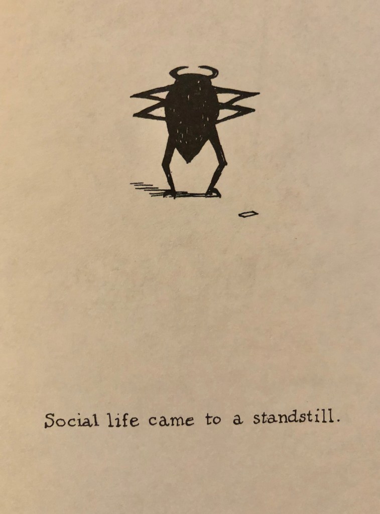 This is a page from The Bug Book by Edward Gorey. The story is about a bunch of bug cousins who are happy and carefree until this new bug (the one in the illustration above) arrives, breaks up their parties, and waylays them whenever they go visiting. The cousins conspire to solve the problem by rolling a rock off a cliff to crush the big bad bug, which they successfully do. The story ends with them slipping the remains into an envelope, addressing it “To whom it may concern”, and propping it up against the fatal stone. That’s it. Then they throw a party.