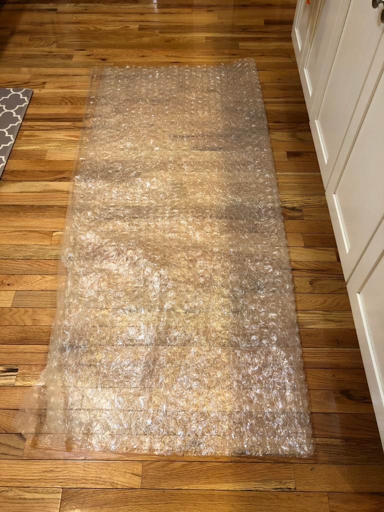 Rubik’s Cubes, thank you for your contribution to society. Stress balls, we appreciate your service. Sensory dough, it’s time to step down. Fidget spinners, you had your moment. Bubble wrap on the kitchen floor takes the cake while you make the cake, put the cake in the oven, ice and decorate and slice and serve the cake then wash the cake pan and cake plates. Oh, and the silverware too. Bonus: when the bubble wrap gives up the ghost, you can roll it up and dispose of it along with any cake crumbs that might have fallen from the counter, which is perfect because the broom is long overdue for a holiday.