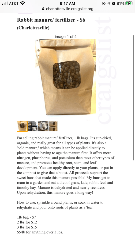 At first, I thought this was completely preposterous. Here was a person trying to SELL his or her pet dung, going so far as to buy bags with cellophane windows to showcase the very thing I literally threw in the garbage every single day, and composing an almost poetically scientific paragraph on its benefits. When I got to the word “tea”, I almost laughed out loud. When I showed the post to my husband when he got home, he branded it “genius”, which made me think. Was this actually a good idea? Had I been foolish to dispose of so many litter boxes full of this stuff, ignorant of its horticultural benefits? I had a vision of myself at a booth at a farmer’s market, sitting on a folding chair and petting Cecil while my children merchandised the fruits of his digestive system, aided by “before” and “after” pictures of my plants to corroborate the utility of our wares. It was laughable, I know, but what an idea: marketable waste! People buy all sorts of crap, so why not see if they’ll buy the real thing?!