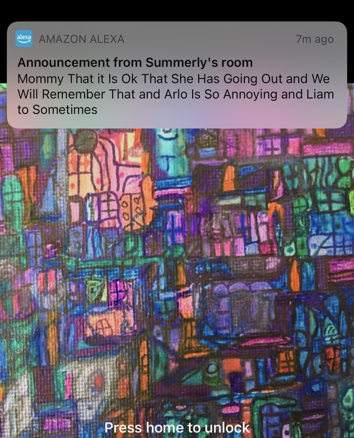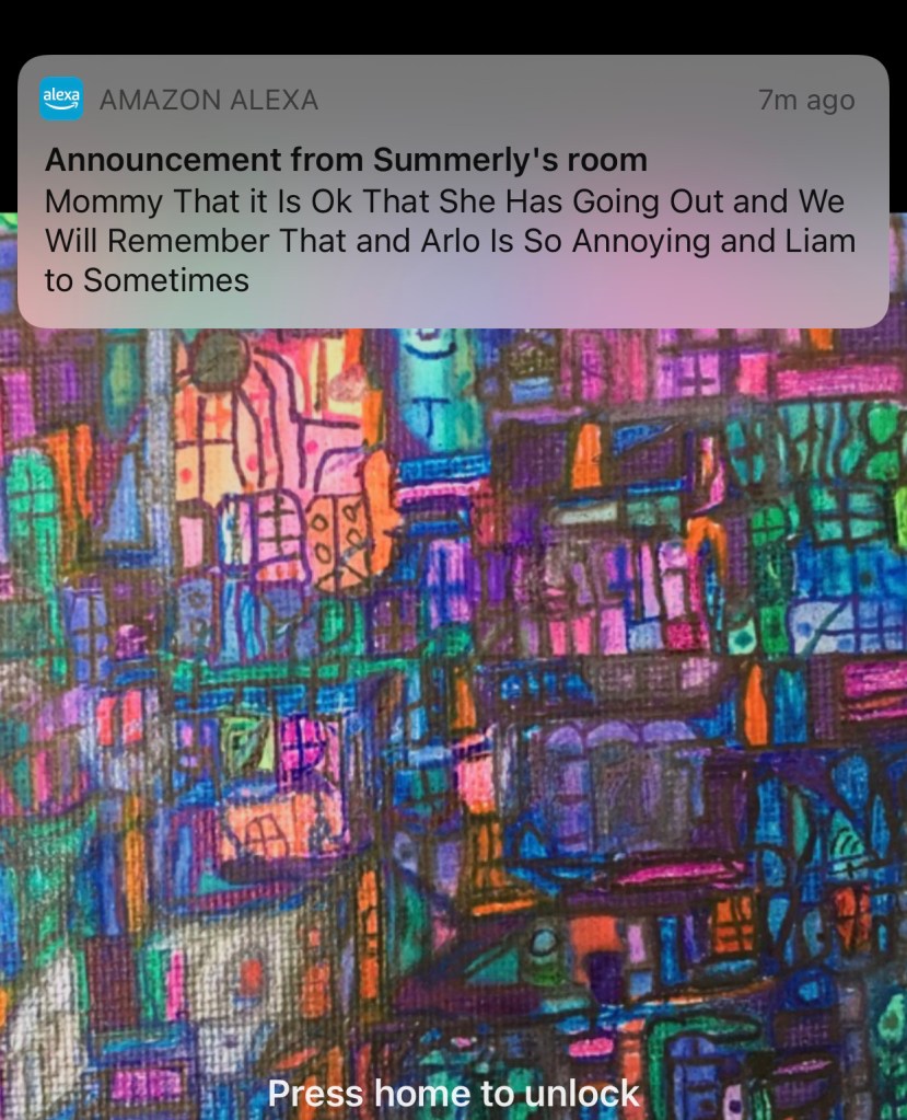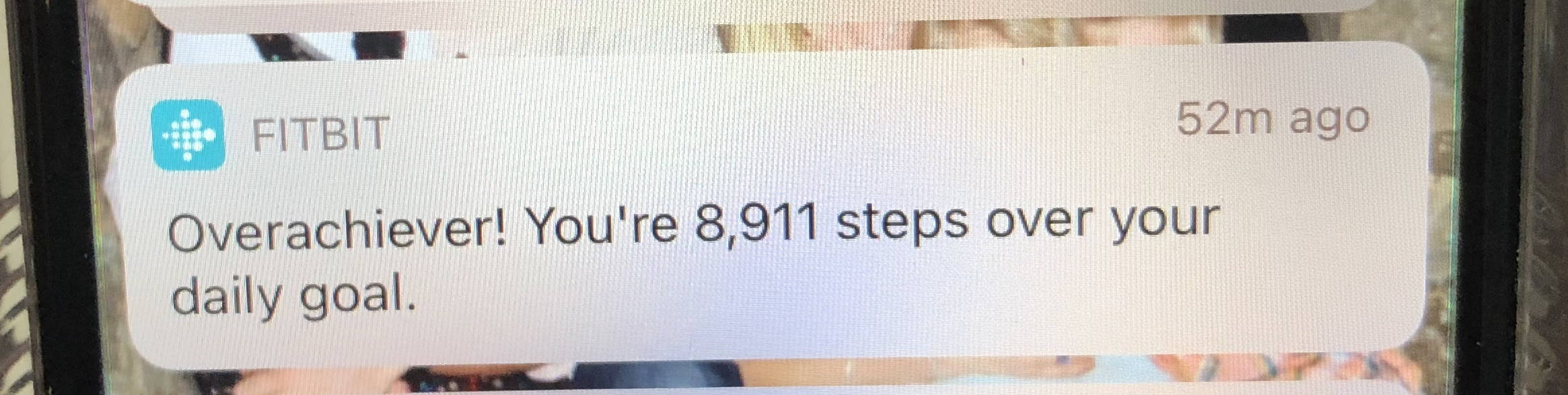 One day near the midpoint of the week, I ran downstairs for glue because Arlo was engaged in an artistic endeavor necessitating its use, and I heard the vacuum rev up on the second floor. At the same moment, I walked by Brian’s phone, which was standing up on its charger in the kitchen, and a notification from his Fitbit was bannered across the home screen. Here it is: